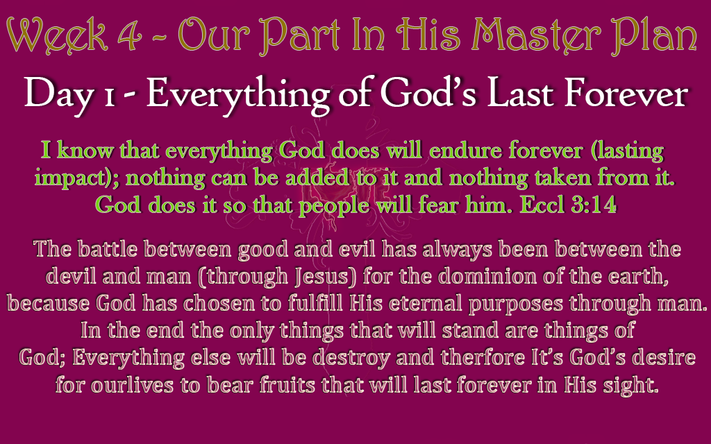 What we do here in this age matters much more than we might think because God is accomplishing His purposes through us. This is done through His grace at work within us (Eph 2:10; 3:20, Phl 1:6; 2:12-13). It’s not something we could do in our strength but it is something we can and should partner with Him as we respond to His grace and leadership in our lives. It is His desire that our lives will bear fruits that will last forever in His sight (Rewards). Join 15:1-16